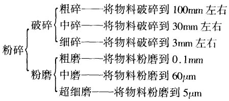 將固體物料破碎的力法有多種,通常采用機(jī)械方法,如顎式破碎機(jī)反擊式破碎機(jī)第三代制砂機(jī)等,物料的破碎作業(yè)一般是在破碎機(jī)和粉磨機(jī)內(nèi)進(jìn)行的,所以按物料破碎的粗細(xì)程度,又劃分為破碎和粉磨兩個過程,如下圖: